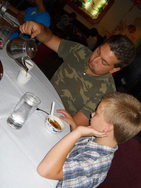The chinese were smart They knew when to drink the tea because the cup was cool enough to hold. As a young Sunday school girl my mom has memories of being taken out to lunch and having tea at a similar type of chinese restaurant.Almost all of us used chopsticks. Isaiah opted for the fork.